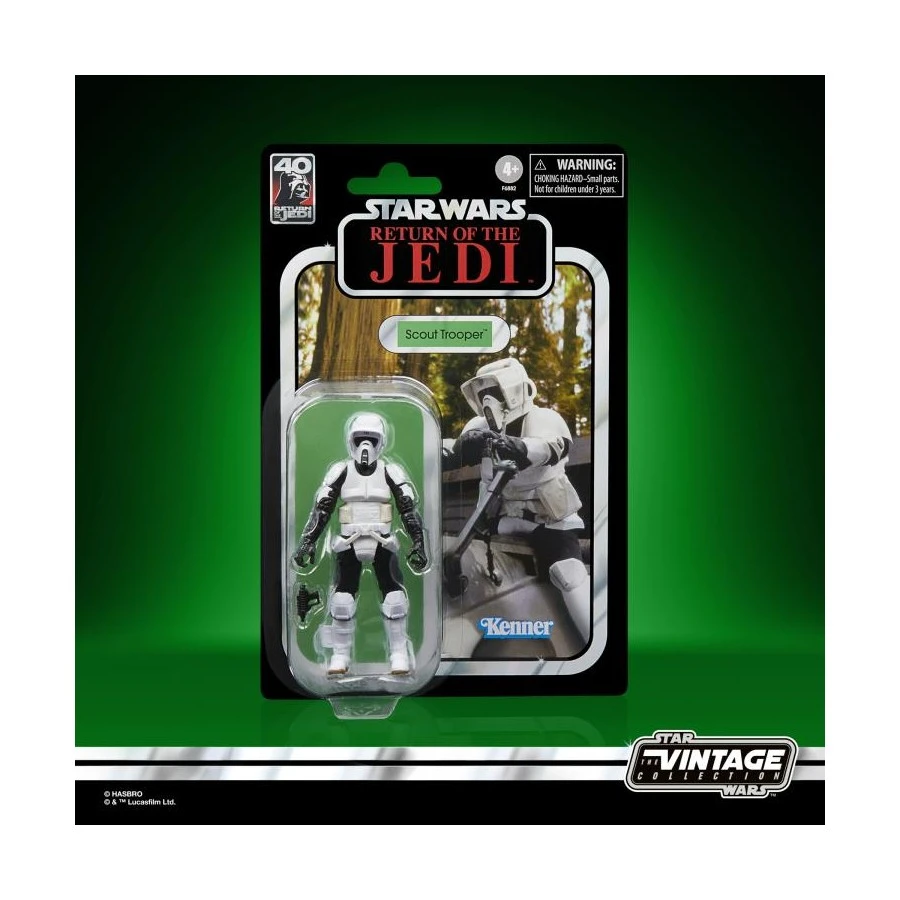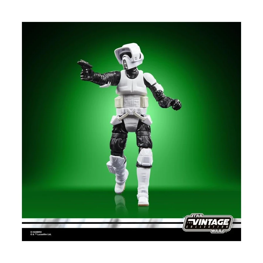 Scout Trooper (alto 9.5cm) e la Speeder Bike tratti da Star Wars Il Ritorno dello Jedi entrano nella line-up Hasbro The Vintage Collection. Vengono forniti con base espositiva e blaster